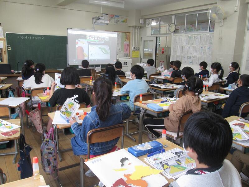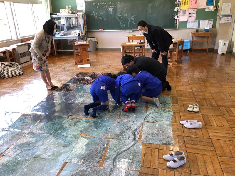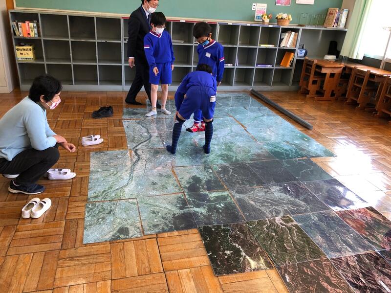 文書館には地図センターがあります。地図センターには県や市町村等が作成した様々な地図や航空写真、衛星写真等が収蔵されています。衛星写真は、広げると縦3メートル、横5メートルの広さになります。その上にのって自分の学校や県庁、ダム、古墳等を探したり、地図帳を見ながら川の名前等を調べたりしました。埼玉県の様子の学習の導入で実施し、子供たちはこれからの学習に興味津々でした。