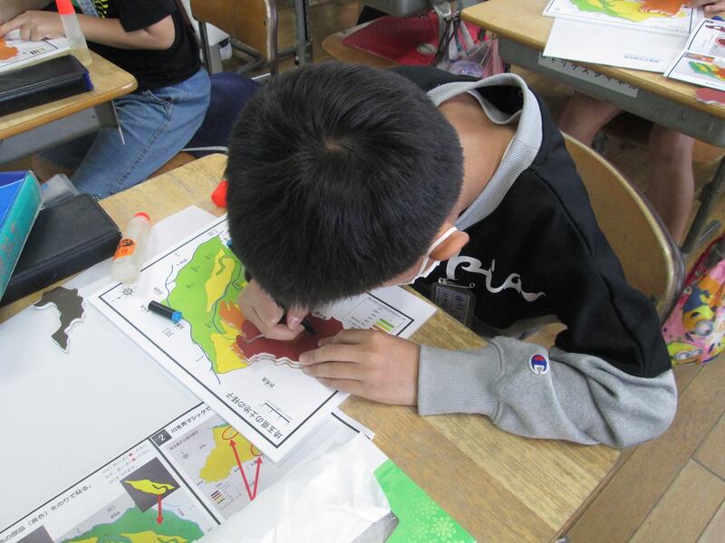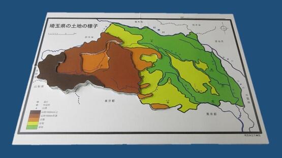 立体地図を作製・活用して埼玉県の地形の特徴を体験的に学習します。手で触りながら台地と低地の高低差や秩父盆地周辺の地形をとらえることができます。下記の学習シートを立体地図に重ねることで、地形と土地利用、交通、産業とのかかわりも学習できます。