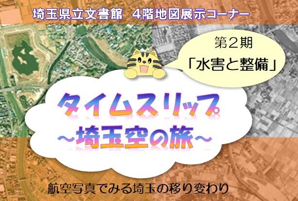令和5年度は、主に地図センター収蔵の埼玉全県航空写真を使い、埼玉県の昔と今の移り変わりを3期にわたり紹介していきます。第2期「水害と整備」では、埼玉県の主な治水施設である有間ダム、川島排水機場、南畑排水機場、大吉調節池に焦点を当てて展示します。