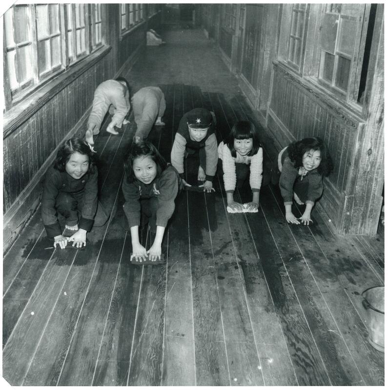 主な資料 ⑪昭和25年(1950) 浦和・常盤小の掃除(裸足で雑巾がけ)(埼玉新聞社撮影戦後報道写真S250055-1-2)