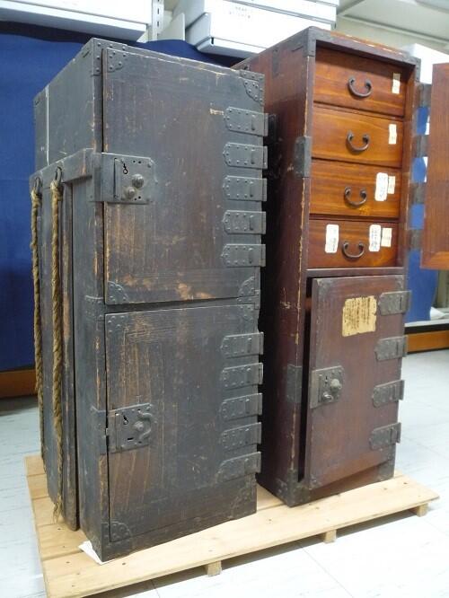 画像左側の文書箱は、大里郡冑山村(熊谷市冑山)の名主を勤めていた根岸家に伝えられた文書箱です。文書箱の中には、名主の執務で作成された様々な文書が保管されていました。文書箱の側面には非常時に箱を背負って運ぶための紐が取り付けられています。