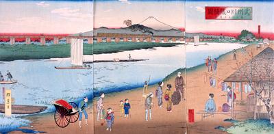 荒川を渡る蒸気機関車を埼玉県側から描いた錦絵
